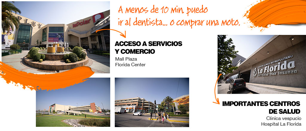 Centro Urbano de La Florida, ubicado en un punto neurálgico de la comuna. Acceso a avenidas y autopistas que conectan con prácticamente todo Santiago. Sector de alta demanda por su variada oferta de servicios y comercios.